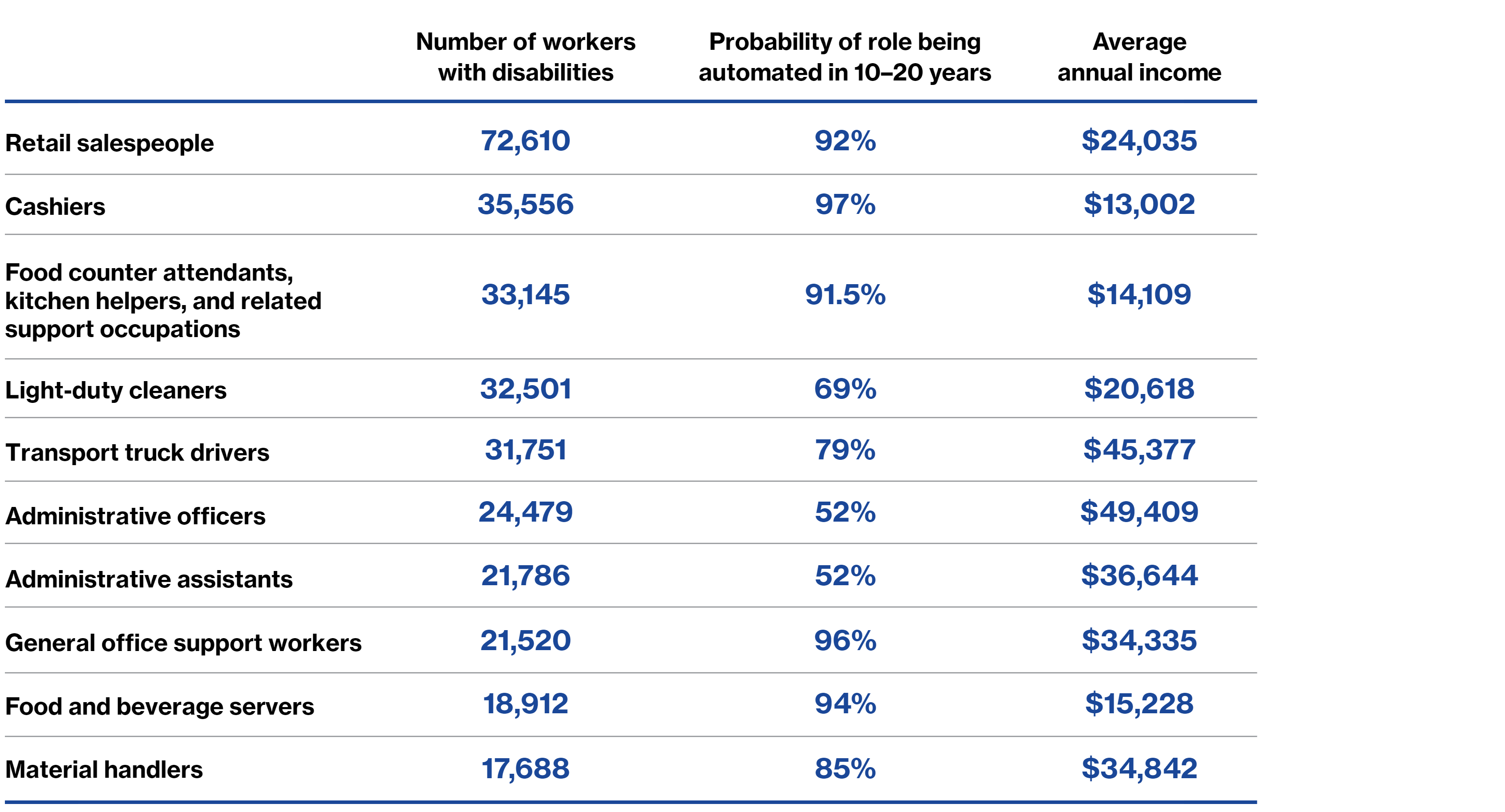 We used Canadian employment data and Signal49 Research modelling to identify the top 10 occupations where people with disabilities often work that are also at high risk of automation.