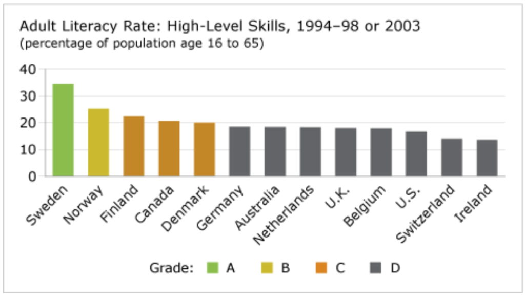 Canada is a “C” performer on the percentage of adults that scored high on adult literacy rate tests. While only 21 per cent of adult Canadians have high literacy skills, Sweden, which leads by a large margin, has nearly 35 per cent of adults scoring high on the literacy test.