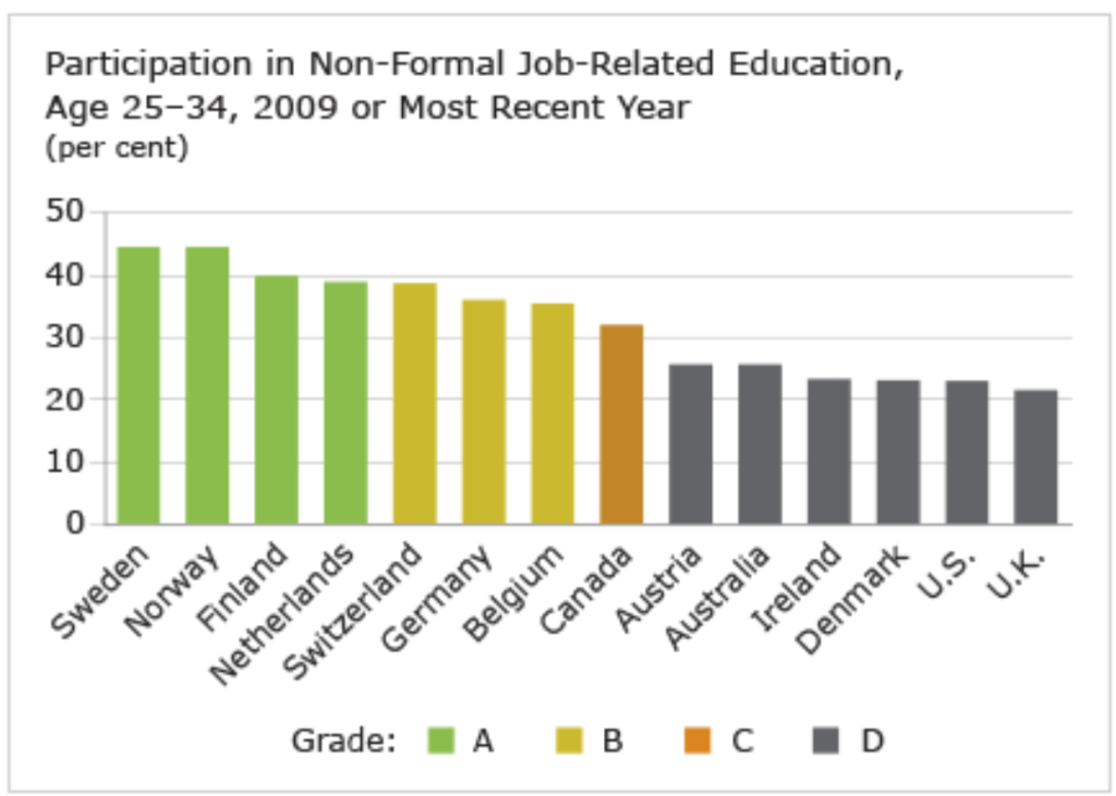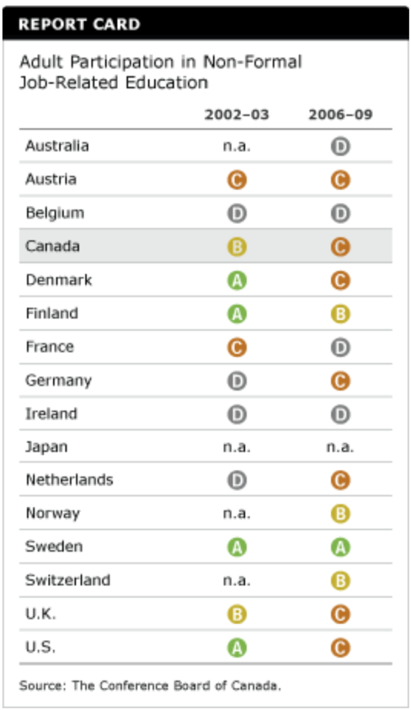 Canada received a “B” in the earlier survey of adult participation in non-formal job-related education. This fell to a “C” in the most recent survey. Canada is a consistent underperformer on this indicator, much to the chagrin of many human resources professionals, proponents of workplace literacy skills development, public and private educators, workers, and labour.