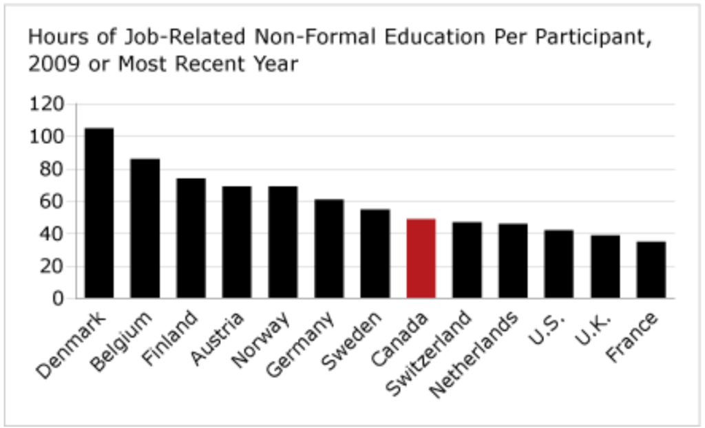 A closer look reveals that not only do Canadians aged 25–64 participate less in non-formal job-related education than their peers in other countries, they also receive, on average, far fewer hours of instruction. Canadian adults received about 49 hours of job-related non-formal education in 2008, less than half the hours of instruction received by adults in Denmark (105 hours) and well behind other peer countries including Belgium (86 hours), Finland (74 hours), Austria (69 hours), Norway (69 hours) and Germany (61 hours).