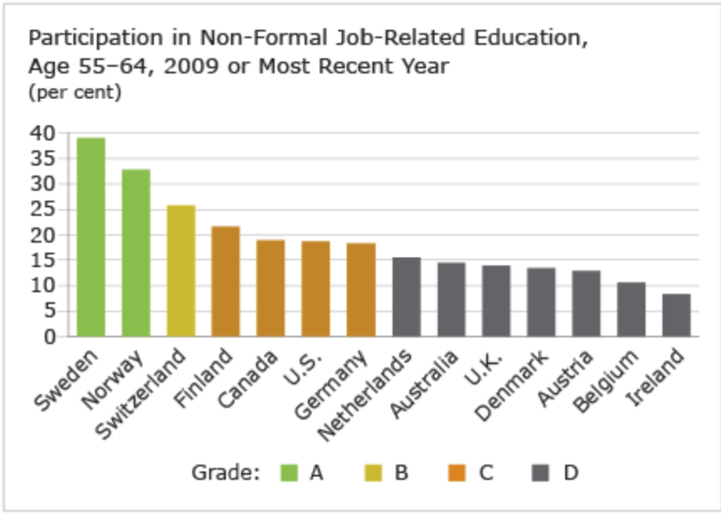 Canada ranks 5th out of 14 countries, and receives a “C” grade, for its participation rate of older adults (aged 55–64 years) in non-formal job-related education and training. With only 19 per cent of older adults participating in educational activities, Canada sits well behind the top-performing economies of Sweden and Norway, where over a third of older adults participate in non-formal job-related education and training.