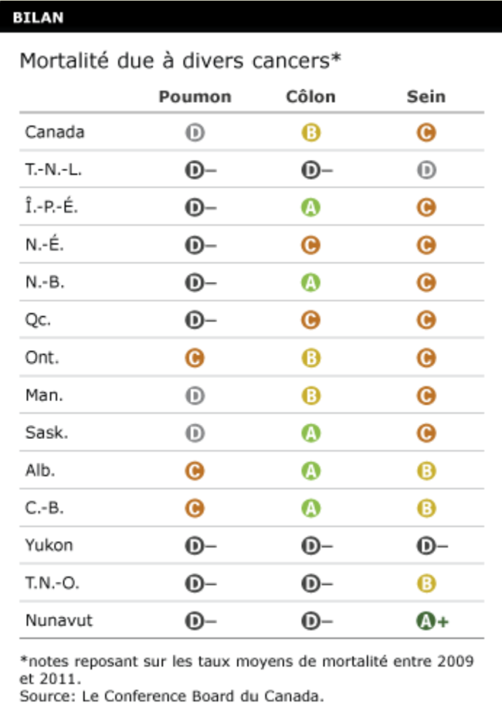 Globalement, le Canada obtient un « B » et se classe au 11e rang sur les 16 pays de comparaison. Les taux de mortalité en Ontario et en Saskatchewan sont inférieurs à la moyenne canadienne, et les deux provinces obtiennent également un « B ». C’est à Terre-Neuve-et-Labrador, en Nouvelle-Écosse et au Québec que les taux moyens de mortalité dus au cancer sont les plus élevés. Avec un « D », les territoires arrivent au dernier rang du classement et se situent même après le pays de comparaison affichant les pires résultats à cet égard, à savoir le Danemark. Entre 2009 et 2011, le Yukon et le Nunavut comptaient, respectivement, jusqu’à 304,2 et 423,5 décès pour 100 000 habitants.