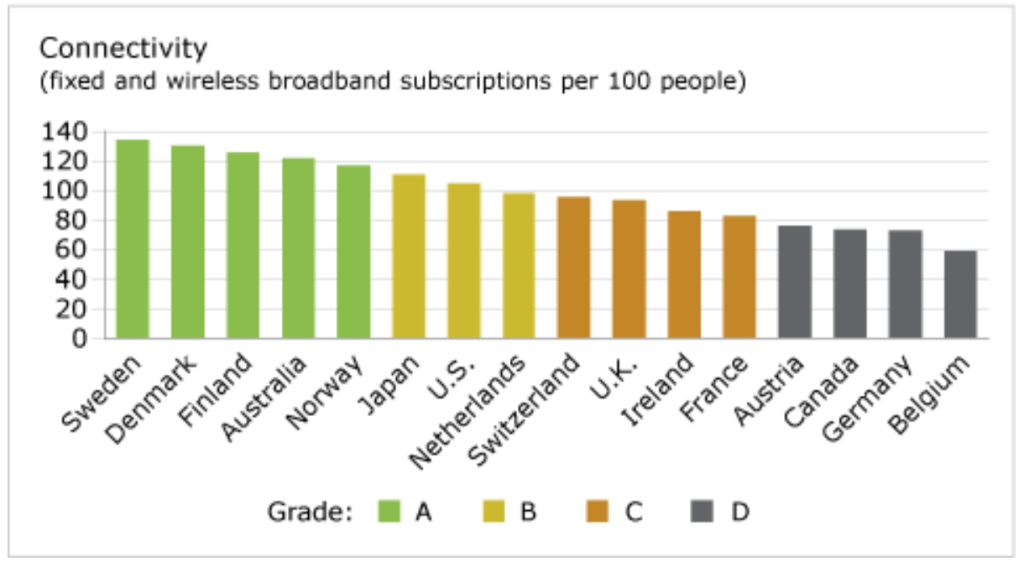 The leader in connectivity report card is Sweden, which earns an “A” grade. Four other countries—Denmark, Finland, Australia, and Norway—also earn “A”s.