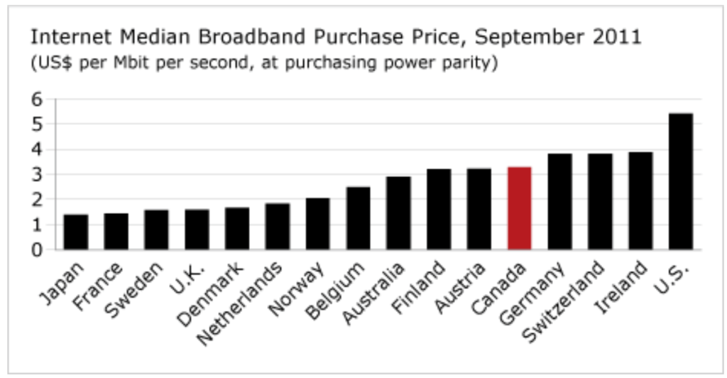 Canada’s median broadband purchase price of US$3.29 per Mbit per second was the 5th-highest price among 16-country peer group in September 2011. The 16-country average was US$2.73 per Mbit per second.