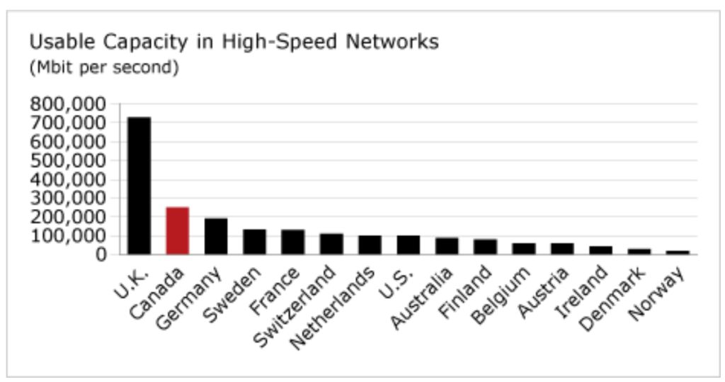 Canada’s median broadband download speed of 24,576 kbits per second puts Canada in 6th place among the 16 peer countries.