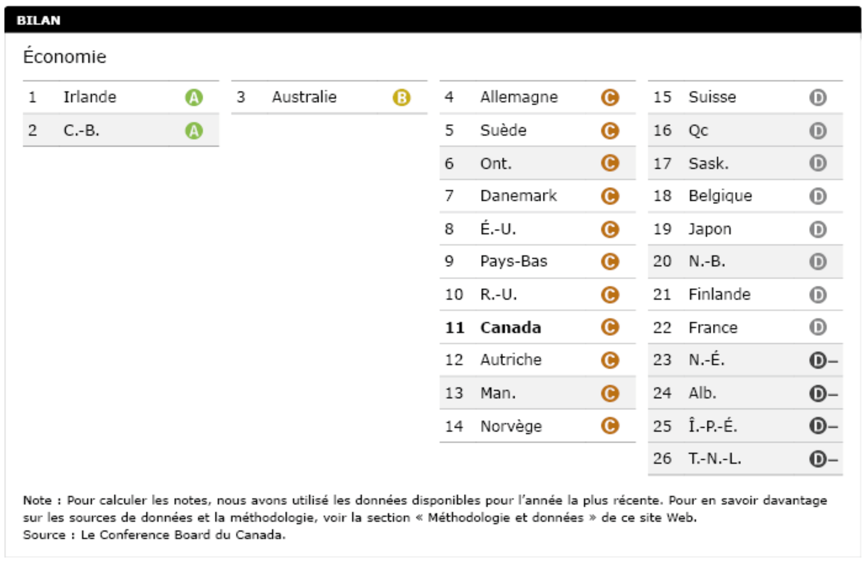 - Avec un excellent résultat global qui lui vaut un A, la Colombie-Britannique arrive en tête des provinces et n’est devancée que par l’Irlande.
