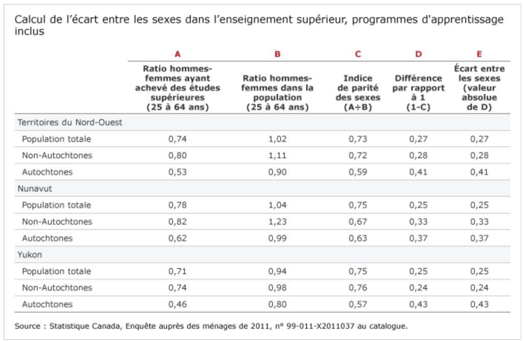 Si nous excluons les programmes d’apprentissage du calcul, nous arrivons à un indice inférieur à 1 pour les trois territoires, ce qui signifie que le ratio hommes-femmes ayant achevé des études postsecondaires est inférieur au ratio hommes-femmes dans la population globale. Autrement dit, la proportion de femmes dans la population ayant fait des études supérieures est plus importante que leur pourcentage de la population le laisserait supposer. Cette tendance est la même dans toutes les provinces et dans l’ensemble du Canada.