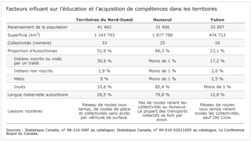 - Les populations autochtones des territoires accusent généralement un retard sur les populations non autochtones pour ce qui est du niveau de scolarité et des compétences des adultes.
