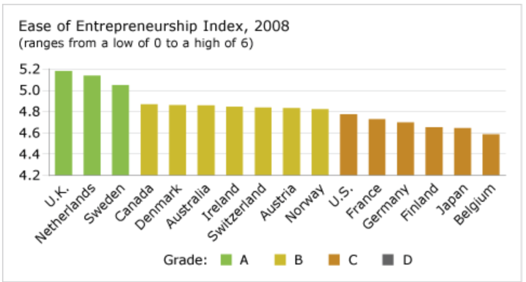- A country received a report card rating of “A” if its ease of entrepreneurship index was in the top third (an index score of 4.985 to 5.194), a “B” if its index score was in the second third (an index score of 4.785 to 4.984), and a “C” if its index score was in the bottom third (an index score of 4.586 to 4.784).
