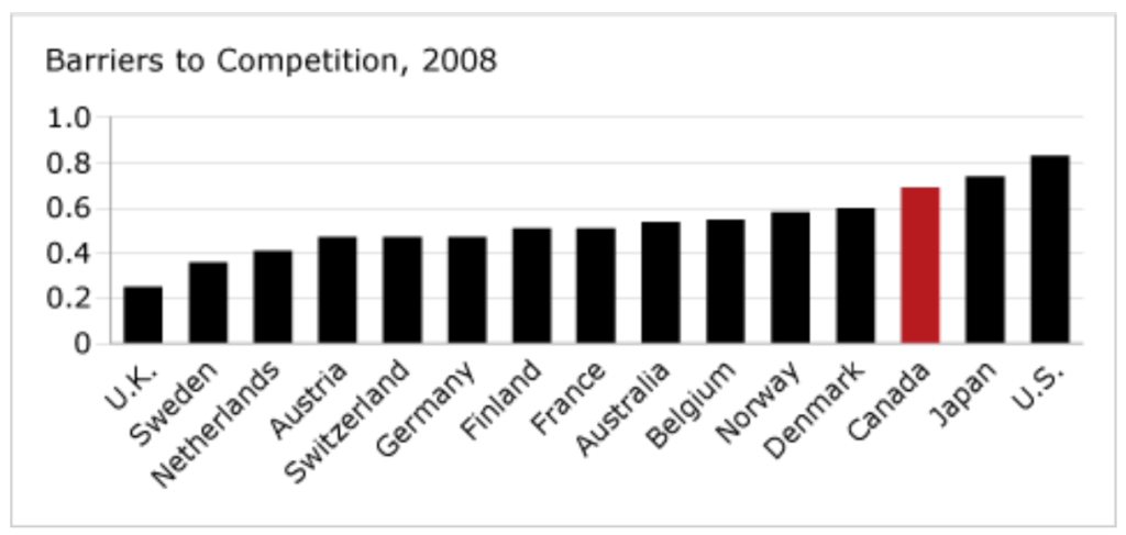 Still, the overall score is an aggregate of scores on three specific sub-indicators—namely, barriers to competition, regulatory and administrative opacity, and administrative burdens for creating new firms—and Canada’s performance on each of these varies considerably. Note that lower values suggest lower barriers.