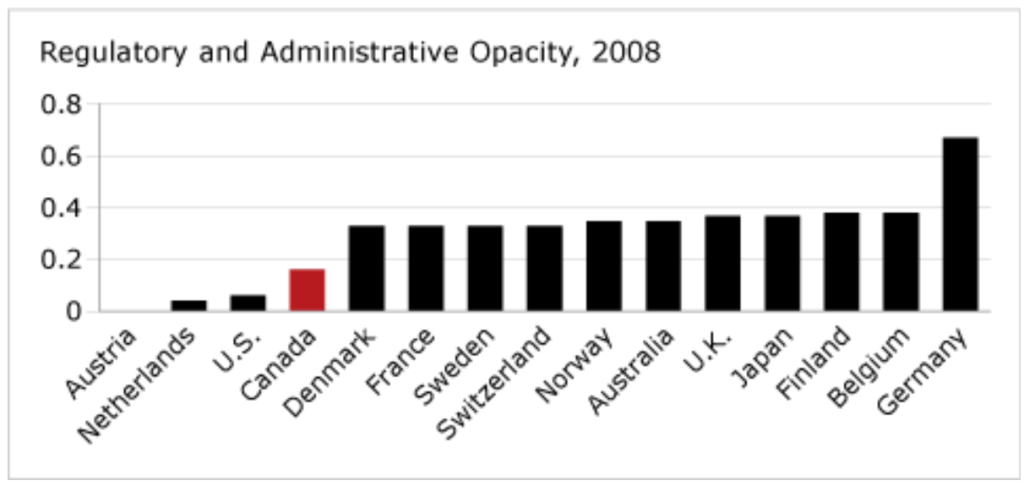On regulatory and administrative opacity, Canada fares much better, with a 4th-place ranking that equals its overall score.