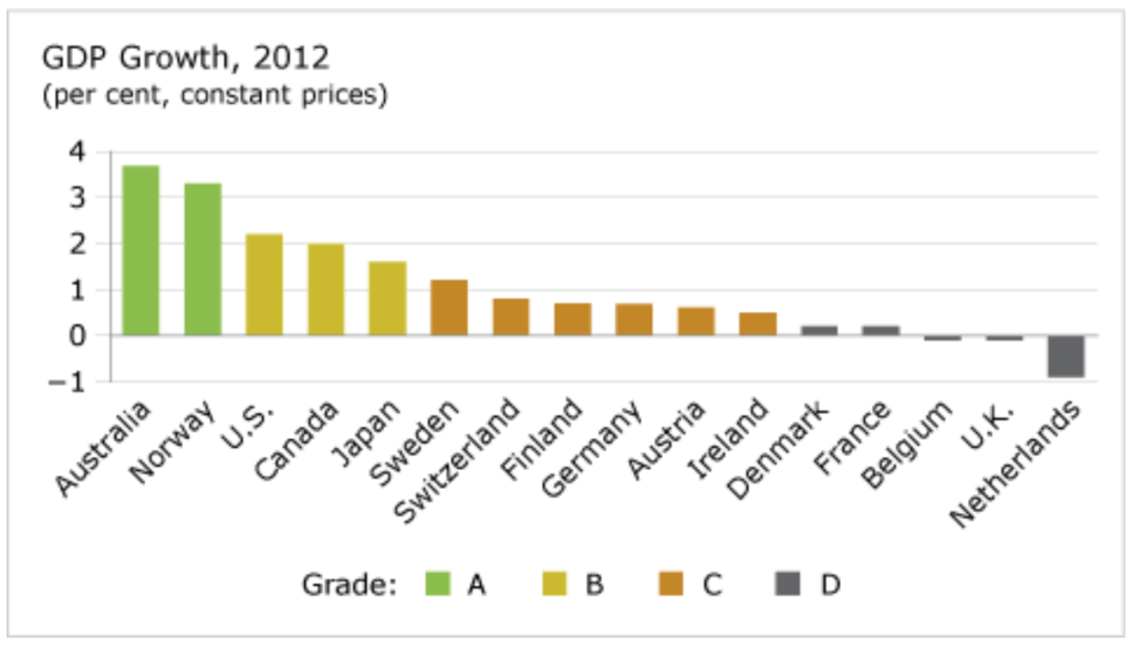 - Australia and Norway are the only two countries with an “A” for GDP growth.