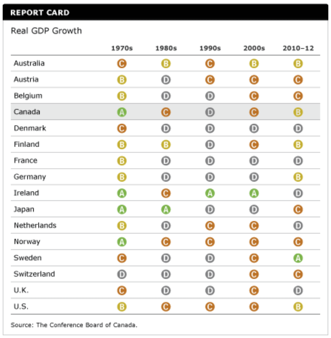 Canada’s real GDP grew rapidly in the 1970s, averaging over 4 per cent per year and earning Canada an “A” grade—despite the recession in 1974–75.