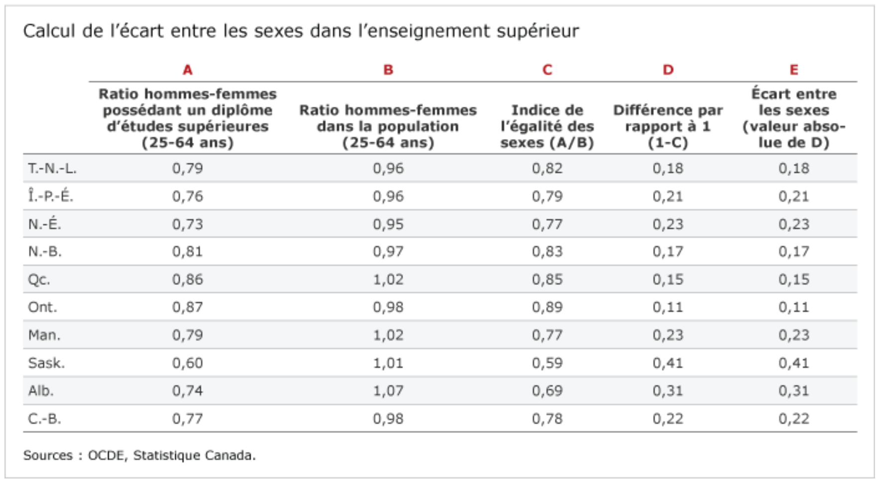 L’écart entre les sexes est ensuite calculé en soustrayant de 1 la valeur de l’indice et en prenant la valeur absolue de cette différence. L’« écart entre les sexes » qui en résulte figure à la colonne E. En fait, dans les provinces ou pays dont l’écart entre les sexes est plus proche de zéro, l’équilibre est plus grand dans l’enseignement supérieur.