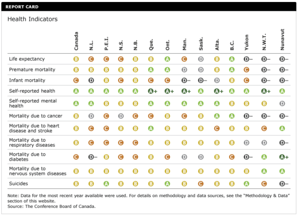 Quebec and Alberta place 11th and 13th, respectively. Each scores a “B” grade overall. Like all the provinces and territories, they rank high on self-reported health status. They have mixed results overall, performing relatively well on some indicators and poorly on others.
