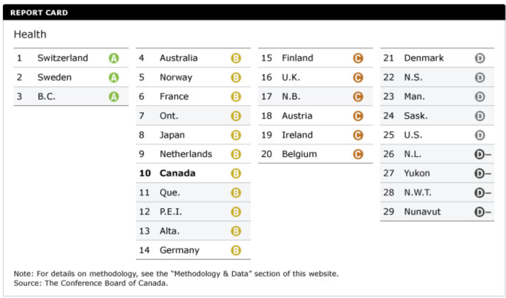 - B.C. is the top-placing province, scoring an “A” on the health report card and ranking third overall, after Switzerland and Sweden.