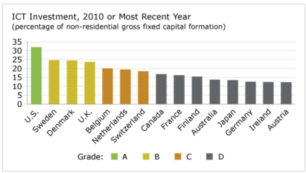 Canada’s ranks 8th out of 15 peer countries on ICT investment as a percentage of non-residential gross fixed capital formation, earning a “D” grade. Canada’s ICT investment in 2010 was 17 per cent of non-residential gross fixed capital formation, slightly lower than the 15-country average rate of 18.5 per cent.