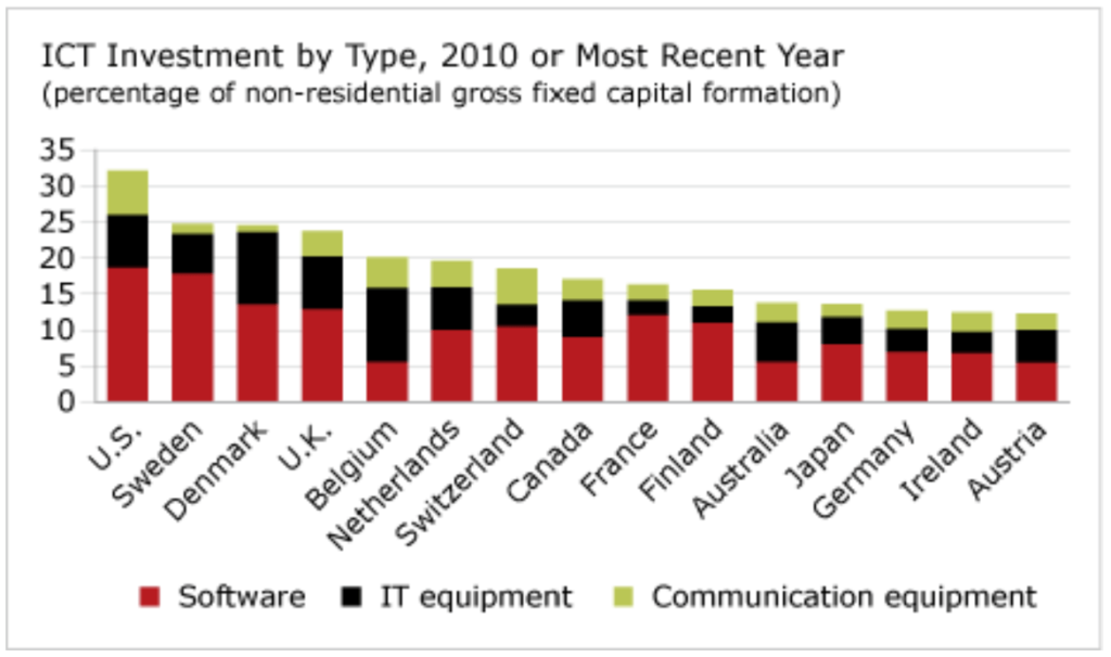 The U.S. is a clear leader in ICT investment. It ranks in first place overall, and also in first place on two of the three subcategories—software and communications equipment. Sweden is in second place overall, mainly thanks to its strong showing in the software category and despite its second-to-last position in the communications equipment category. Denmark places third overall, thanks to its strong showing in the IT equipment and software categories.