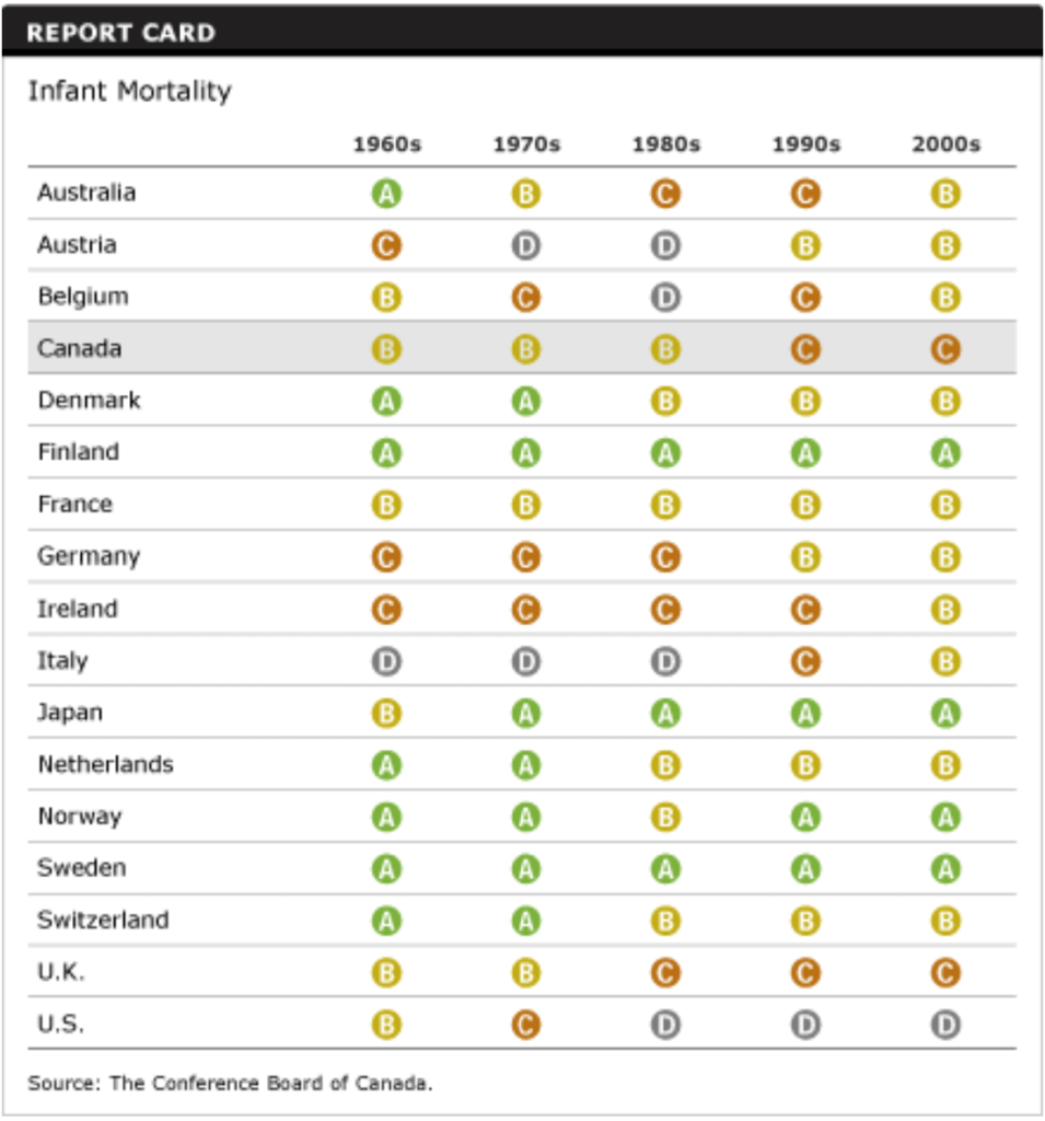 Canada’s relative grade on infant mortality dropped from a “B” in the 1960s, 1970s, and 1980s to a “C” in the 1990s and 2000s.