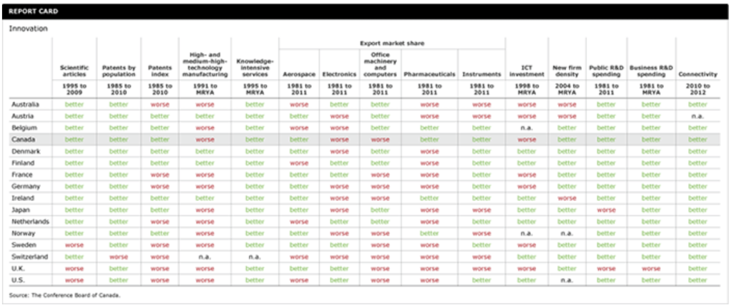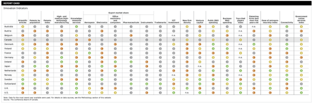 Canada performs poorly on most indicators, scoring 13 “D”s, 2 “C”s, 6 “B”s, and no “A”s. The “D” grades underline Canada’s relative weakness in all three categories of the innovation process—creation, diffusion, and transformation.