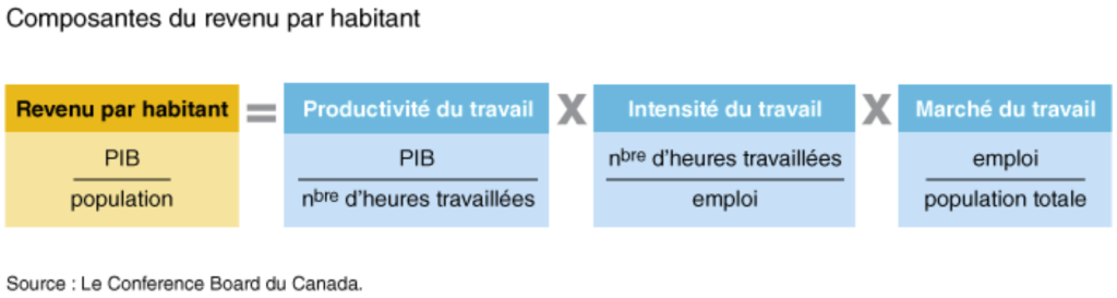 Dans l’équation ci-dessous, la productivité du travail est la seule composante sans limites supérieures. Par conséquent, l’amélioration de la productivité est le seul moyen durable de réduire l’écart considérable qui subsiste entre les revenus par habitant des provinces et des États-Unis.