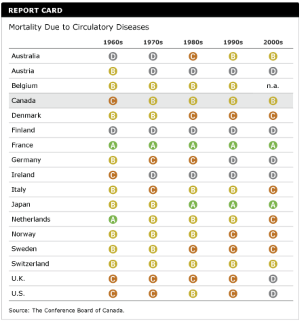 Canada reduced deaths due to circulatory diseases from 584 per 100,000 population in 1960 to an estimated 131 in 2009—an average decline of 3 per cent per year. Only Australia managed a larger cut in its mortality rates—by 3.3 per cent, on average, per year.