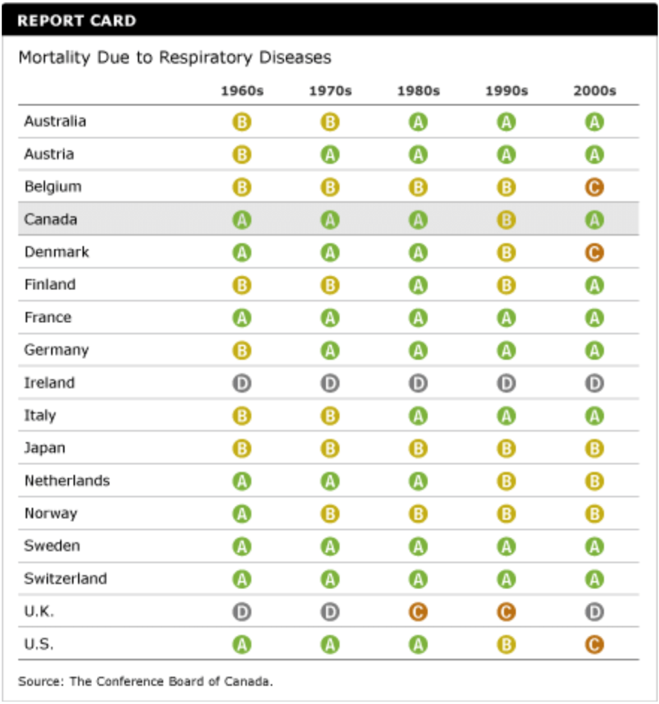 Canada earned a “B” in 2009, ranking 9th out of 17 peer countries, for an estimated mortality rate of 38 deaths per 100,000 population.6 The mortality rate due to respiratory system diseases ranges from Finland’s low of 24 deaths per 100,000 population to Ireland’s high of 68 deaths. The most recent year of published data on mortality due to respiratory disease for Canada is 2004, with 43 deaths per 100,000 population.