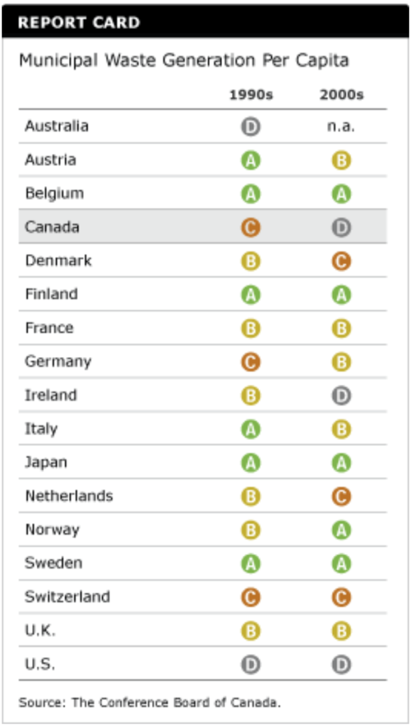 But by 2002, Canada’s per capita municipal waste was worse than in the United States. Canada’s grade fell to a “D.”