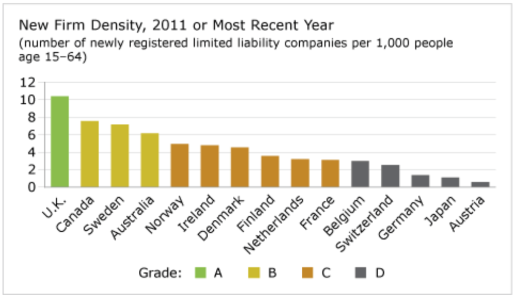 The U.K. is the lead country in the new firm density report card and has been a top performer for many years. In 2011, the number of start-ups established in the U.K. was 429,363—which translates into a new firm density of 10.41 firms per 1,000 working-age people. Not surprisingly, the hot-bed for new ventures was London, with about 160,000 start-ups. Other top cities in the U.K. for new firms included Birmingham, Manchester, Bristol, and Brighton.4