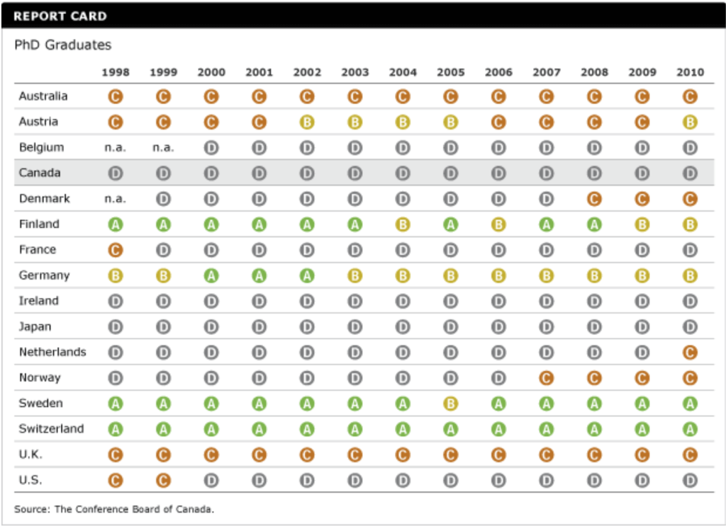 Although Canada increased its number of PhD graduates by 3 per cent per year over the past decade, it has earned a “D” on this indicator since 1998, the earliest year for which internationally comparable data are available. The top spots have consistently been taken by Sweden and Switzerland.