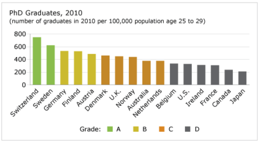 Canada will remain a “D” player for some time. Its poor performance here is a serious concern that does not bode well for the future. The failure to fund world-class universities is one explanation for Canada’s comparative weaknesses in high-level academic achievement—and its associated weaknesses in innovation. Furthermore, Canada offers fewer employment and pay incentives than do other countries to encourage students to pursue doctoral studies.
