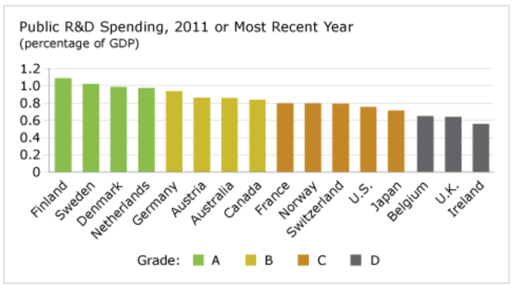 The top spot is claimed by Finland. Like its high performance in business R&D spending, Finland’s ascent to top spot in public R&D spending is a relatively recent phenomenon with its origins in its coordinated response to economic crisis in the 1990s. In 1981, Finland ranked 12th out of 16 countries on public R&D spending; by 1990, it had climbed only to 10th place. On the basis of robust action and spending by leaders in business, government, and academia in the face of an economic crisis, Finland quickly became one of the top spenders. With public R&D spending amounting to 0.99 as a percentage of GDP, Finland climbed into top spot by 1999. It has ranked first every year except 2008, when the country was briefly eclipsed by Sweden.