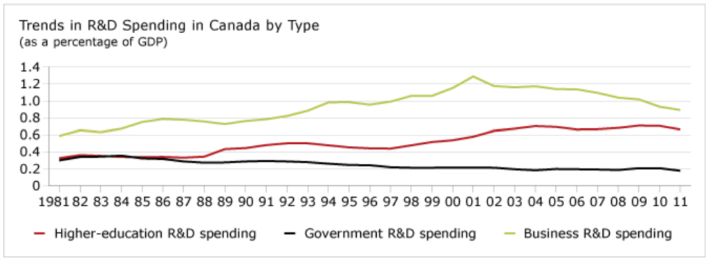 While Canada has increased public R&D spending over the years and briefly ranked in the top three or four among its international competitors, its long-term performance relative to peers has been mediocre.