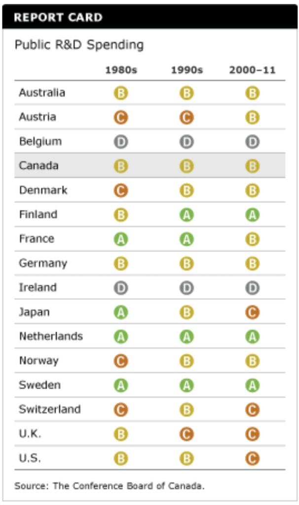 In short, although Canada increased its investments in this important area for most of the past 15 years, international competitors also increased their own investments—leaving Canada a “B” performers in each decade.