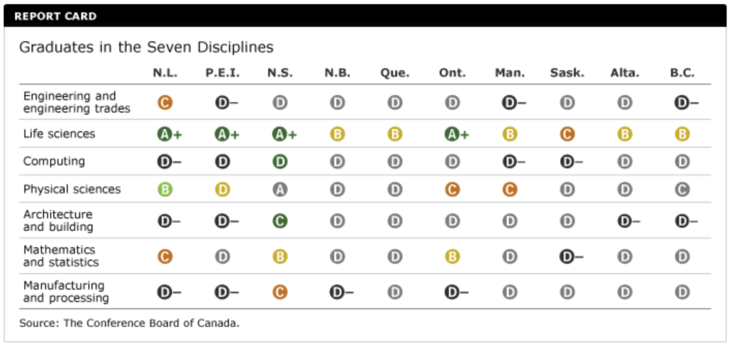 When examined separately, the provinces do have some strengths. All provinces perform relatively well in life sciences. Four provinces earn “A+” grades, having more per capita graduates in life sciences than any of Canada’s international peers. Unfortunately, in the other categories, most provinces get “D” or “D–” grades.