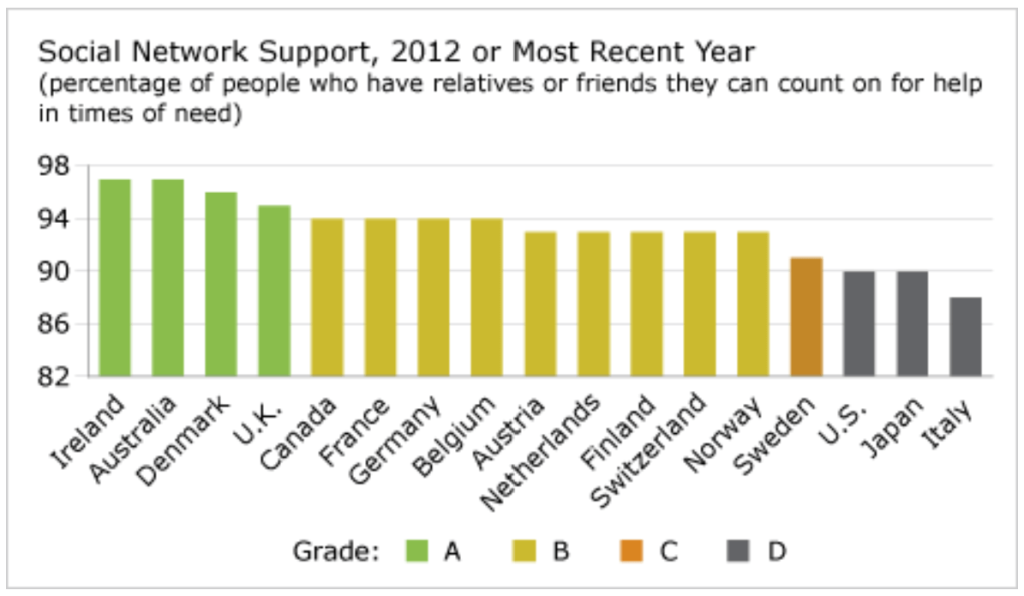 Social network support is measured for this report card as the proportion of respondents in each country who answered “yes” to the following question: “If you were in trouble, do you have relatives or friends you can count on to help you whenever you need them?”
