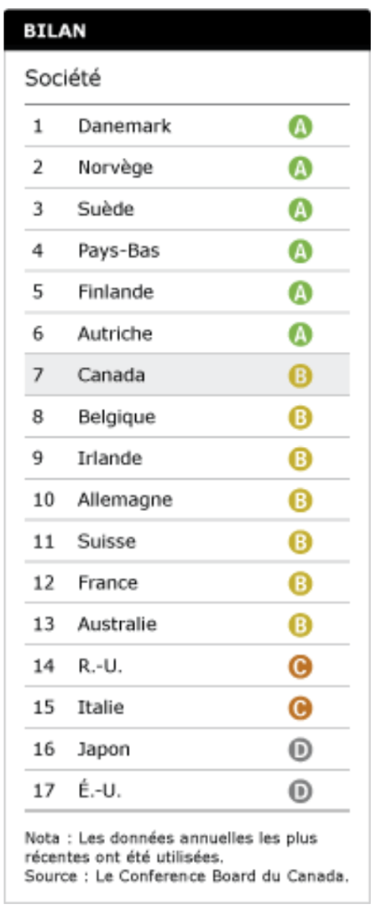 Le Canada a toujours obtenu un « B » dans son bilan sur la société, ce qui le situait dans le milieu du peloton dans les années 1990 et 2000. Durant ces mêmes années, il avait été noté « A » pour quatre indicateurs : la pauvreté chez les personnes âgées, les homicides, la satisfaction face à la vie et l’acceptation de la diversité. Le Canada n’a pas réussi à hausser sa performance à l’endroit de plusieurs indicateurs. Le « C » qu’il continue d’obtenir pour la pauvreté chez les enfants et le glissement à « D » pour la pauvreté chez les personnes en âge de travailler sont ses résultats les plus désolants.