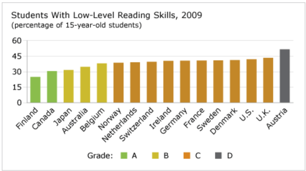 With an impressively low 25 per cent of Finnish students scoring low on the PISA assessment, Finland once again finds itself in first place among 16 peer countries and is the only other country to receive an “A”.