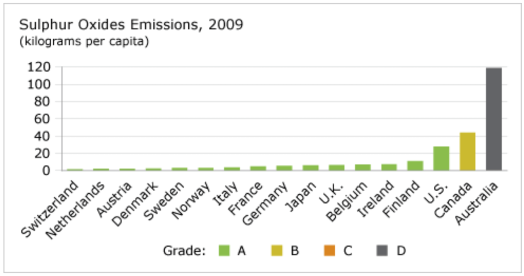 Canada earns a “B” grade for sulphur oxides emissions and ranks 16th out of 17 peer countries. Only Australia receives a lower ranking.
