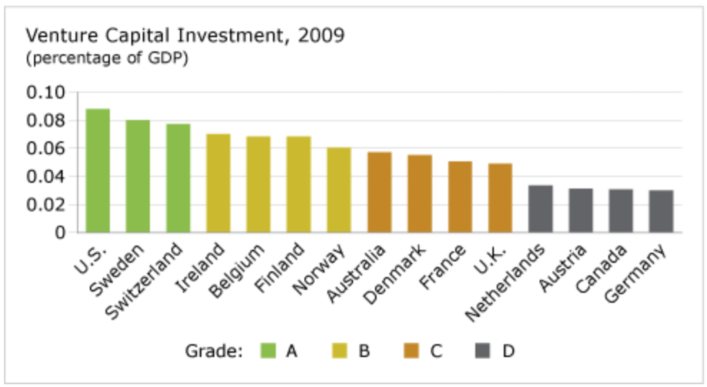 The top performers on the venture capital report card are the U.S., Sweden, and Switzerland. All three of these countries score an “A” grade, with venture capital accounting for over 0.075 per cent of each country’s GDP. The U.S. has the most developed private sector financing market.11