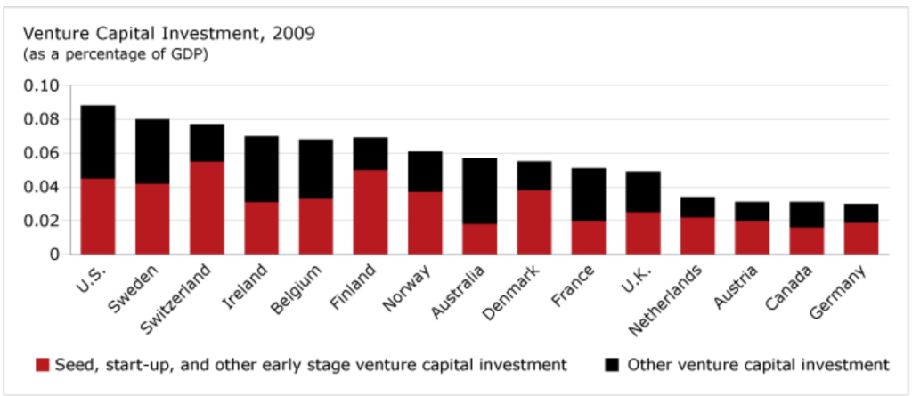 It is a key source of both financial and managerial experience for new business ventures in Canada, and is a critical component of many countries’ innovation ecosystem. Unfortunately, Canada underperforms on the venture capital report card. Canada simply does not have the same level of “speculative capital activity” as most of its peers.4