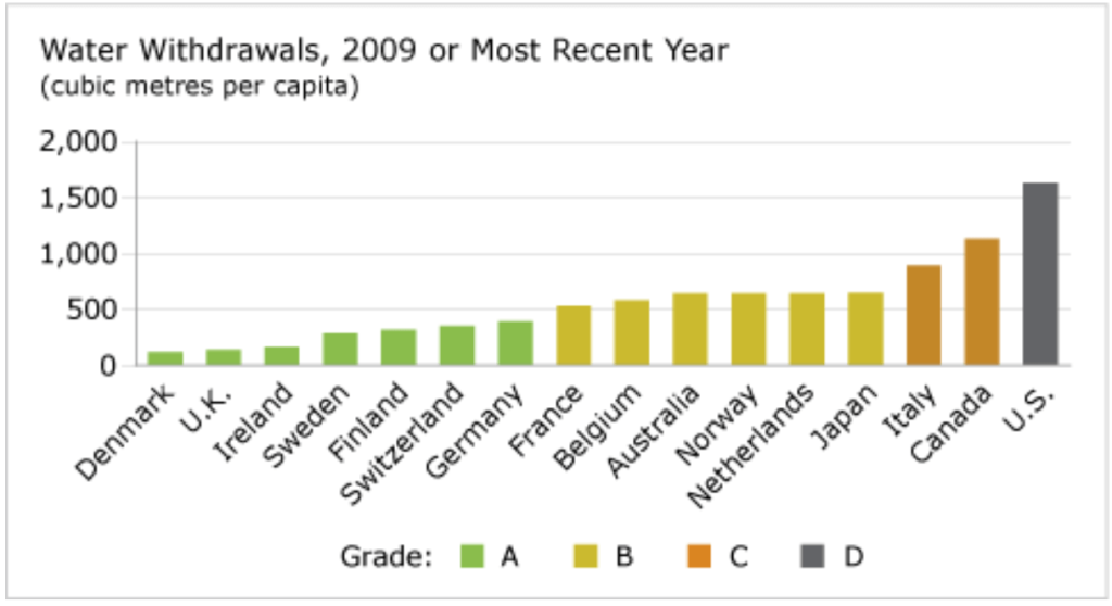Eight of Canada’s peer countries had freshwater withdrawals below the average of 572 cubic metres per capita; seven of those countries received “A” grades.