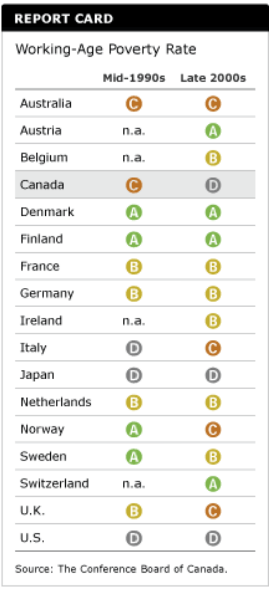 Canada’s working-age poverty rate increased from 9.4 per cent in the mid-1990s to 11.1 per cent in the late 2000s—causing Canada’s relative grade to drop from a “C” to a “D.”