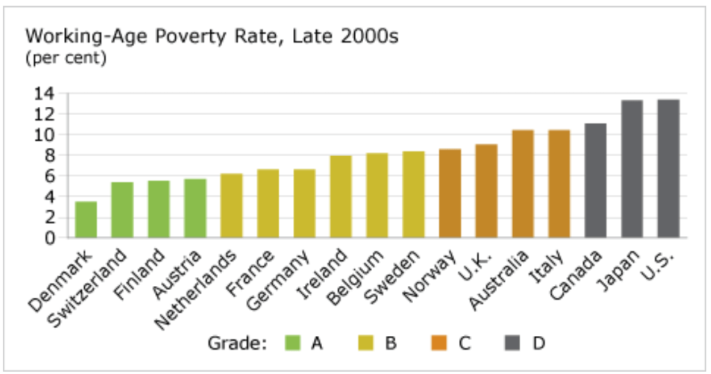 The U.S. continues to have the highest poverty rate among industrialized countries. It earns a “D” grade with a poverty rate among working-age people of 13.4 per cent.