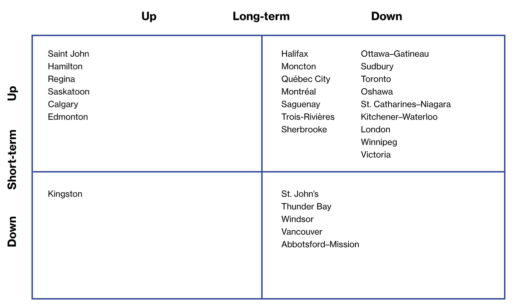 Note: Positioning in the quadrant indicates short- and long-term expectations for each CMA’s housing market. The best position would be in the up–up quadrant, which shows positive prospects for both short- and long-term growth. The worst position would be the down–down quadrant.