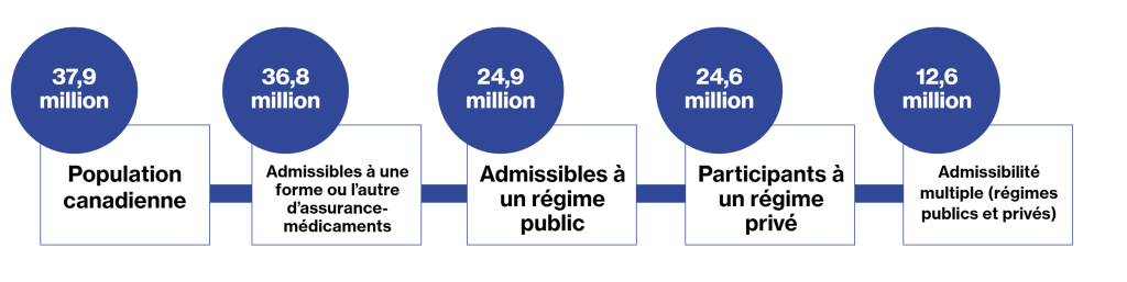 La plupart des Canadiens—97,2 %—sont admissibles à une forme ou l’autre d’assurance-médicaments d’ordonnance. Cela comprend les assurances offertes par les régimes publics et privés d’assurance-médicaments.