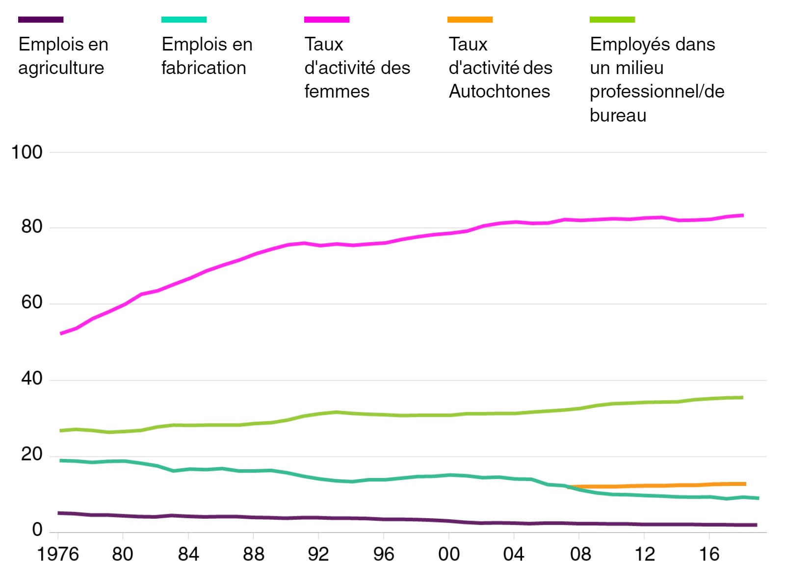 Sources de données/taux d’activité des Autochtones : Signal49 Recherche, Statistique Canada, Tableau 14-10-0363-01, Emploi selon le groupe autochtone et la profession, certaines provinces et régions (x 1 000), dernière modification, le 3 juillet 2019.