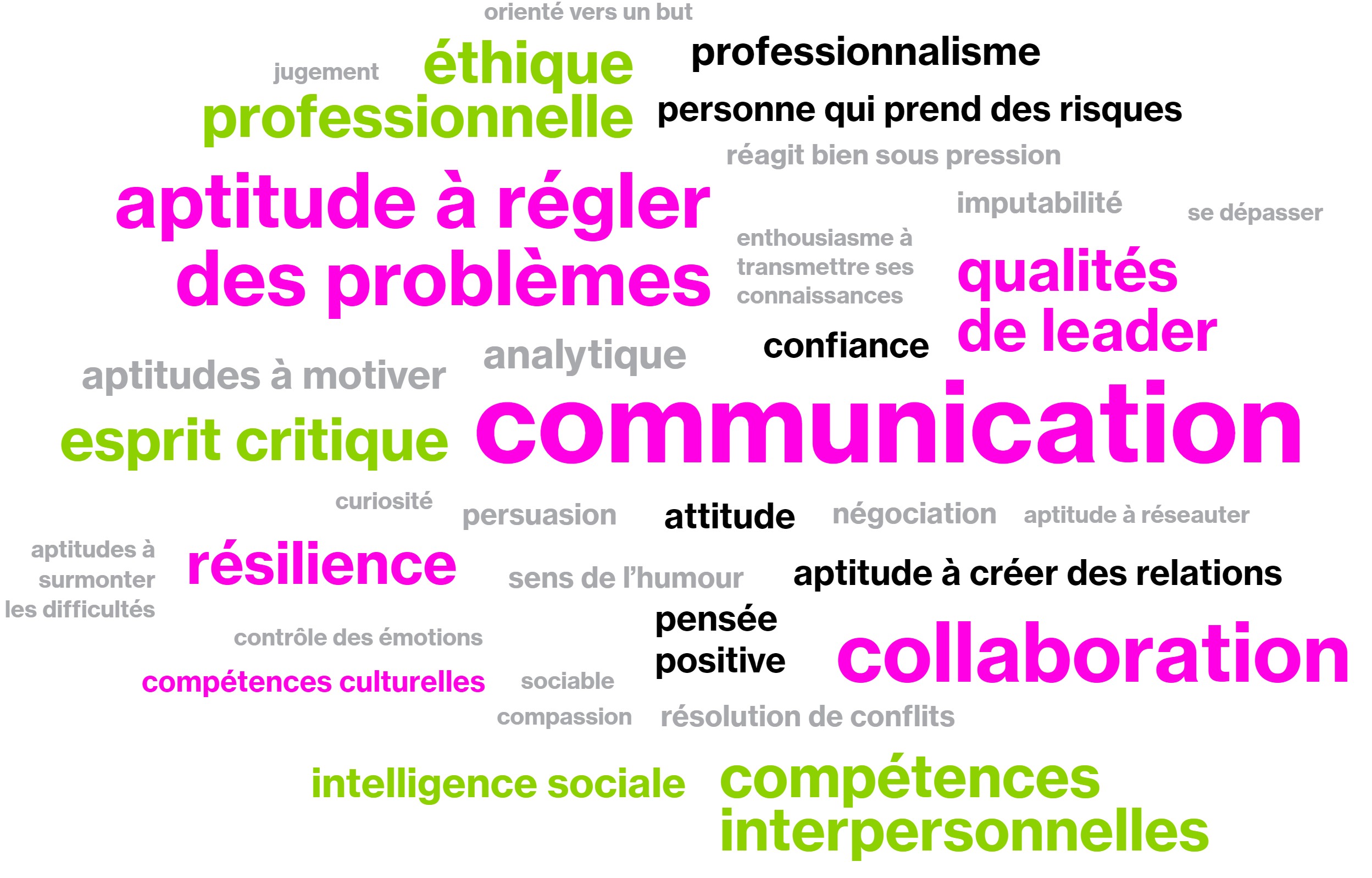 Lors des discussions sur l’évolution de l’économie et des besoins en compétences au Canada, les compétences suivantes reviennent souvent : le leadership, la résilience, la communication, la collaboration, la résolution de problèmes et les compétences interpersonnelles.