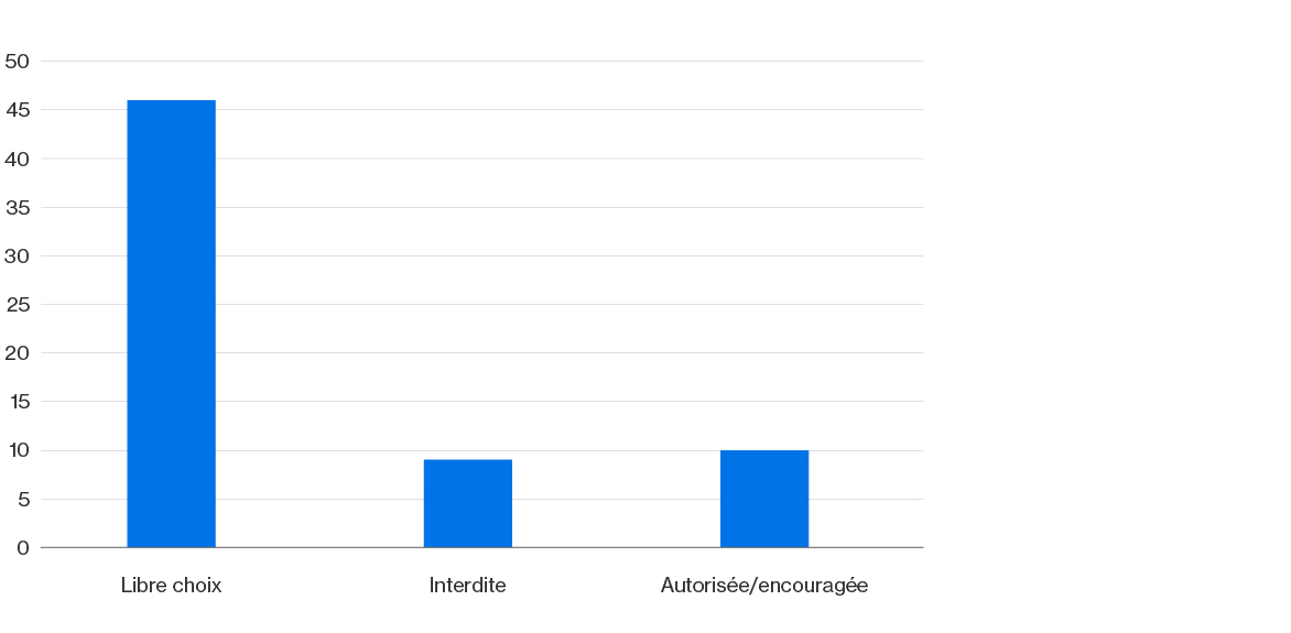 Les établissements d’enseignement postsecondaire canadiens qui soutiennent officiellement l’IA générative ont généralement pour politique de laisser les enseignants décider de la pertinence d’intégrer l’IA dans leurs cours et, le cas échéant, de la façon de le faire (voir le graphique 2).