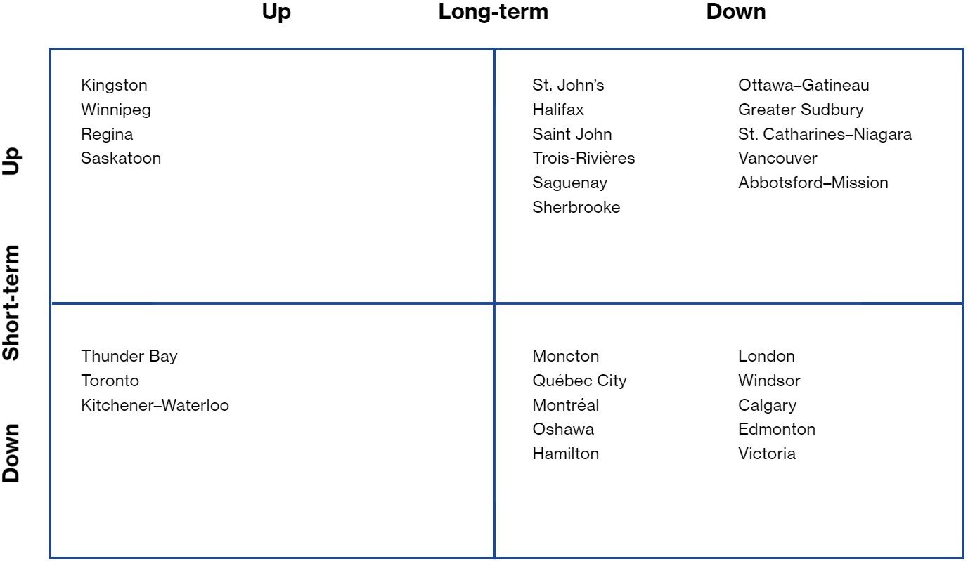 Note: Positioning in the quadrant indicates short- and long-term expectation for each CMA’s housing market. The best position would be in the Up-Up quadrant which shows positive prospects for both short- and long-term growth. The worst position would be the Down-Down quadrant.